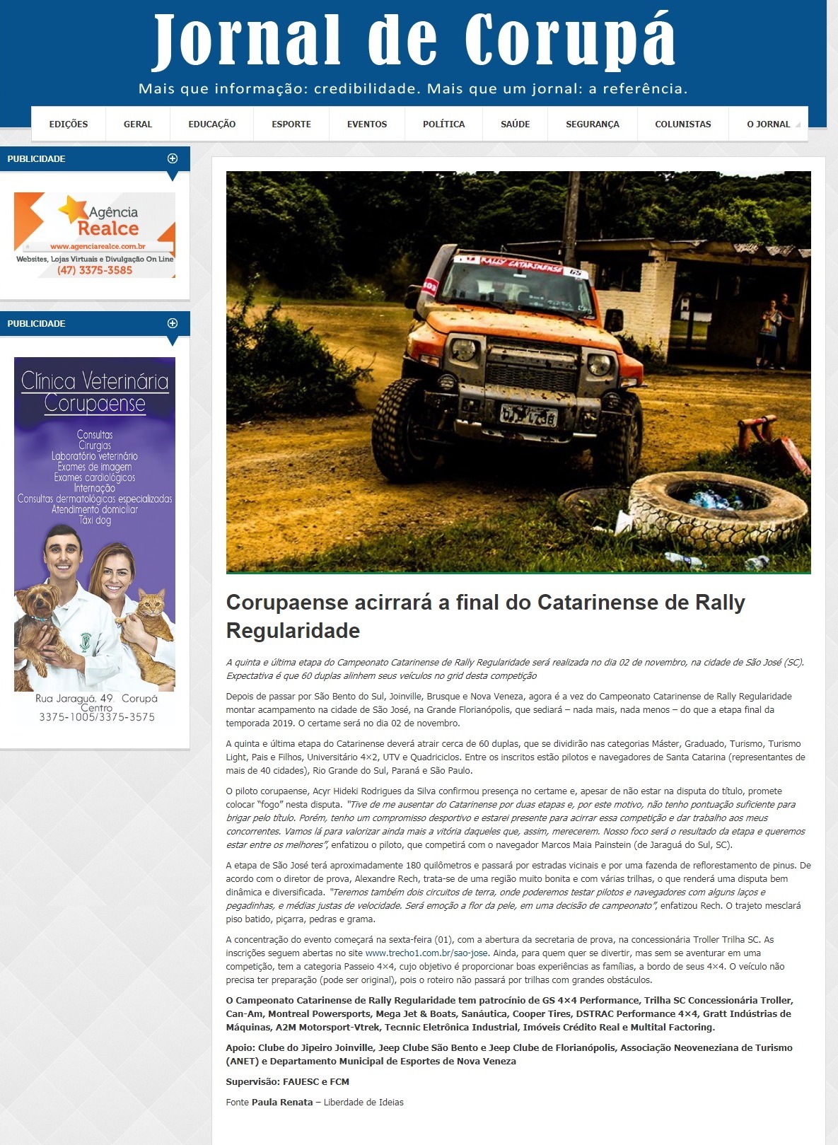 Decisão do Campeonato Catarinense de Rally Regularidade 2019 será neste sábado
