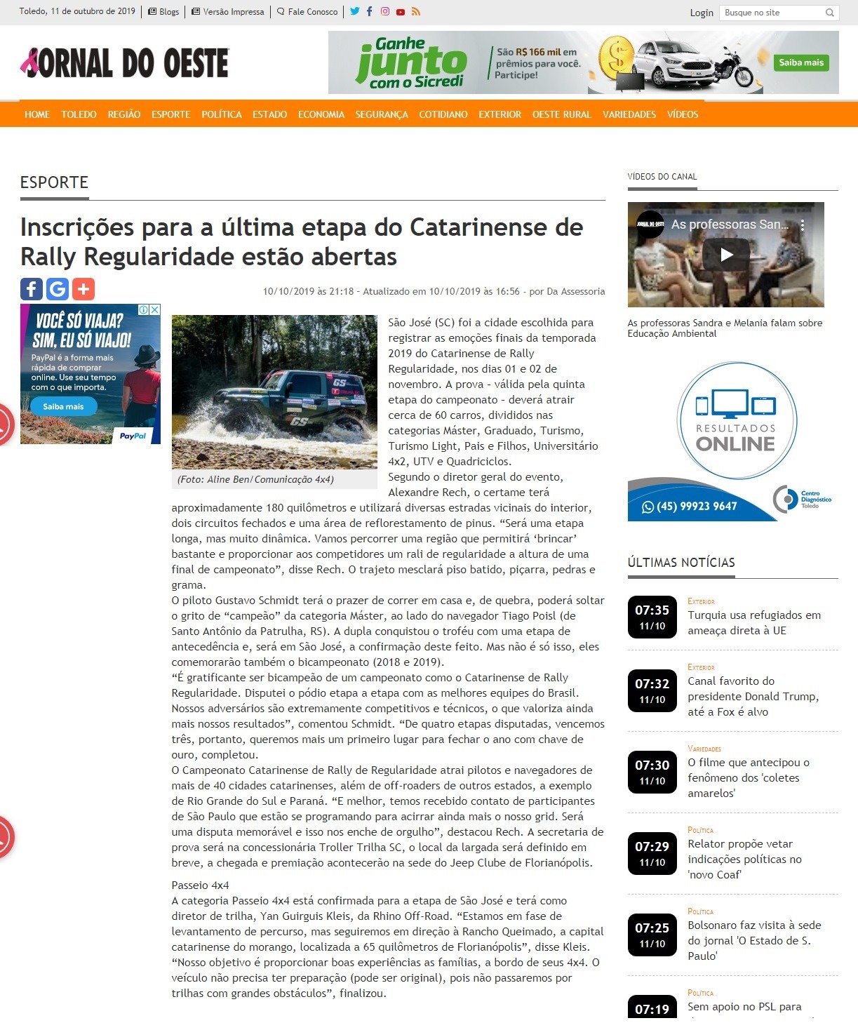 A quarta etapa do Campeonato Catarinense de Rally Regularidade teve um grid recorde de 69 veículos e reuniu mais de 230 pessoas na cidade do sul de Santa Catarina Sabe aquela pequena cidade de interior? [...]